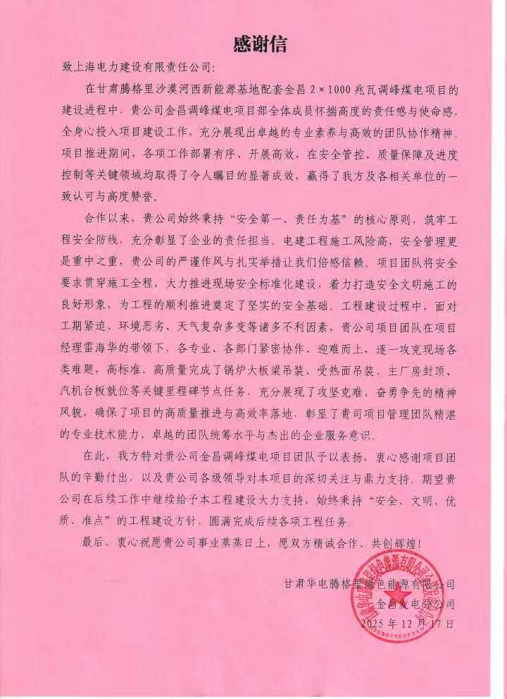 近日,金昌调峰煤电项目收到业主方发来的感谢信。字里行间满含真挚谢意与高度认可,既是对金昌2×1000兆瓦调峰煤电项目建设成果的由衷赞誉,更是对项目团队实干担当的最佳褒奖